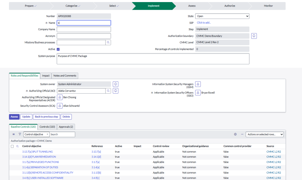 - Select: Appropriate control objectives are brought into the authorization package based on asset classification and the selected CMMC level. IRM Pro’s mapping ensures that only the controls relevant to the defined boundary and CUI data flows are included.